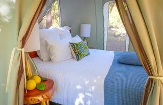 The Camp features beautifully decorated walk-in tents with real beds, lovely linens, bedside tables, lanterns, towels, yoga mats, fans, storage space, rugs, chairs, and more. Each tent has it's own compost toilet room.There is a library/reading area, a yoga space and a comfortable stargazing area where you can comfortably recline under the big mountain skies. Sierra Xantus Café is where our on-site chef makes three wonderful meals every day – and daily happy hour of course - and there is a shower cabaña with deliciously hot water from the solar water heater.